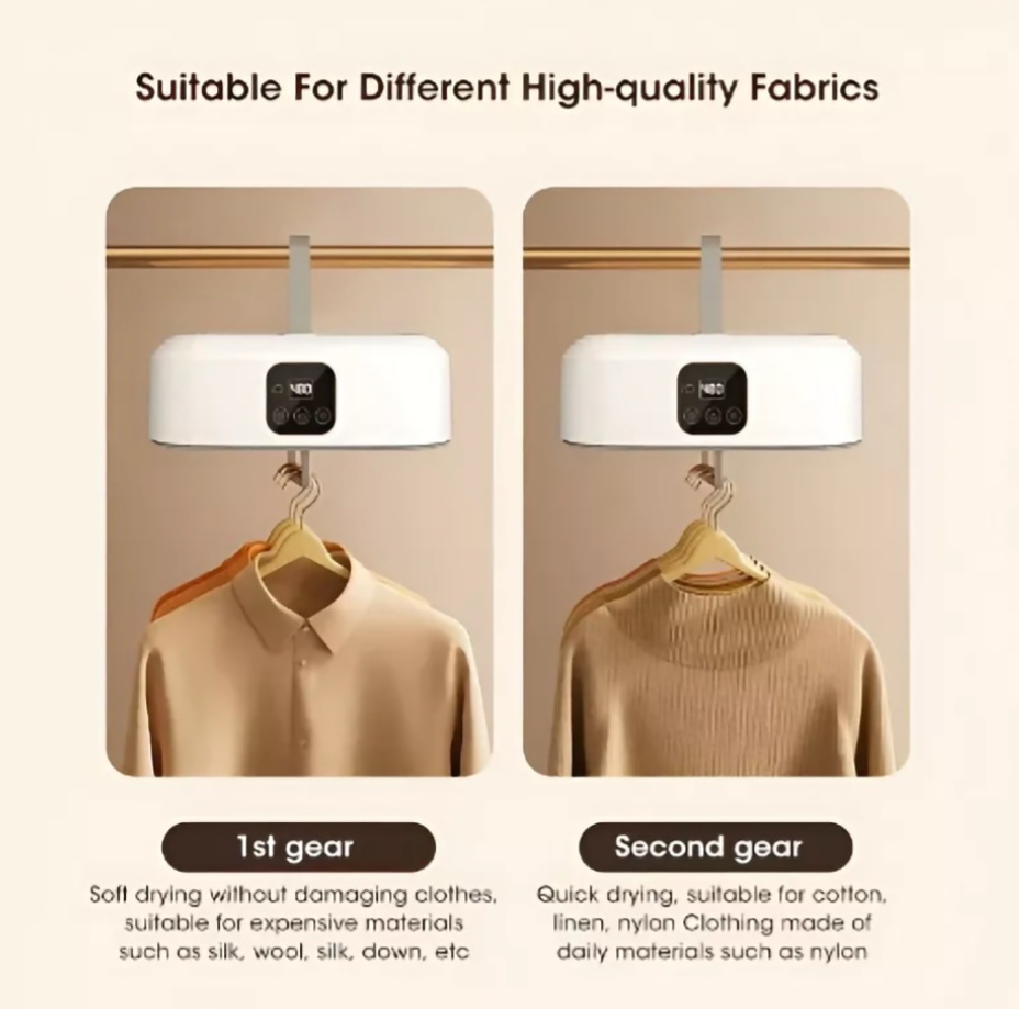 Efficient, Gentle, and Hygienic DryingThe Mini Portable Foldable Electric Dryer uses warm lightwave heating technology to remove moisture while being gentle on fabrics. Unlike harsh drying methods, this system helps protect your clothes from damage, shrinkage, and excessive wear.In addition to drying, it also helps eliminate odors and mites, keeping your laundry clean and hygienic — an especially valuable feature for travelers, families, and those living in humid environments.